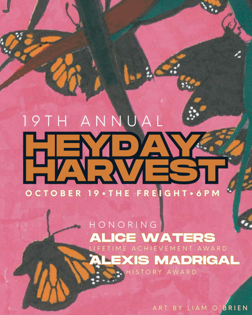 It’s that time of year again. Join us for our annual Harvest Gala, our annual fundraiser. This year’s program will feature Heyday award recipients Alice Waters and Alexis Madrigal in conversation, plus special guests Susan D. Anderson, John Freeman, Dorothy Lazard, Eugene Rodriguez, and Greg Sarris, with musical performance by Los Cenzontles.